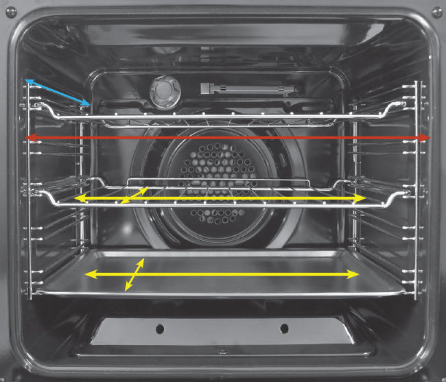 2. The stone must rest flat on the rack or tray. Next, be sure the width and depth allow for the stone to rest flat on the oven rack. In the example image shown, the stone dimensions cannot be bigger than the depressed rack size (the yellow arrows) otherwise the stone will not rest flat on the rack. If this is the case with your oven, use these measurements when determining the correct stock size to purchase or ordering your custom cut stone.